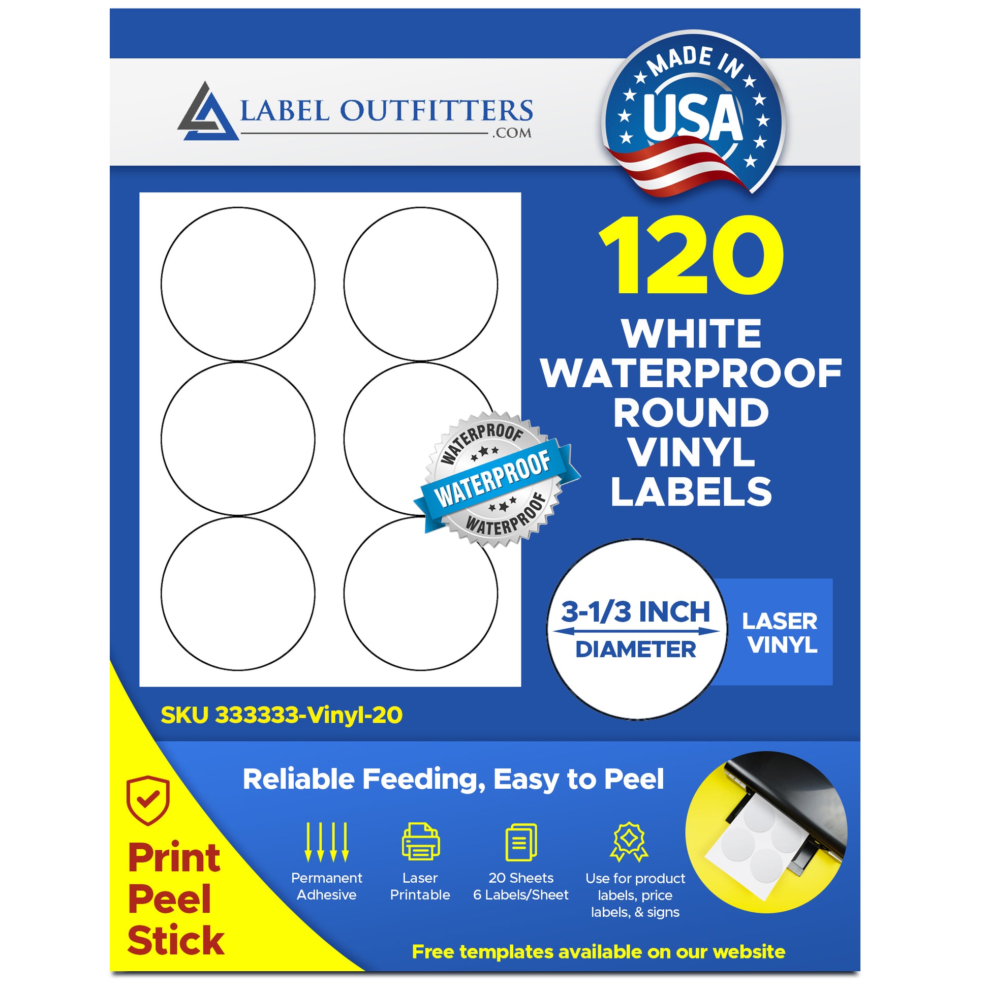 120 White Vinyl Weatherproof Durable Laser Labels 3.33" Diameter Labels 6 Labels Per Sheet 20 Sheets