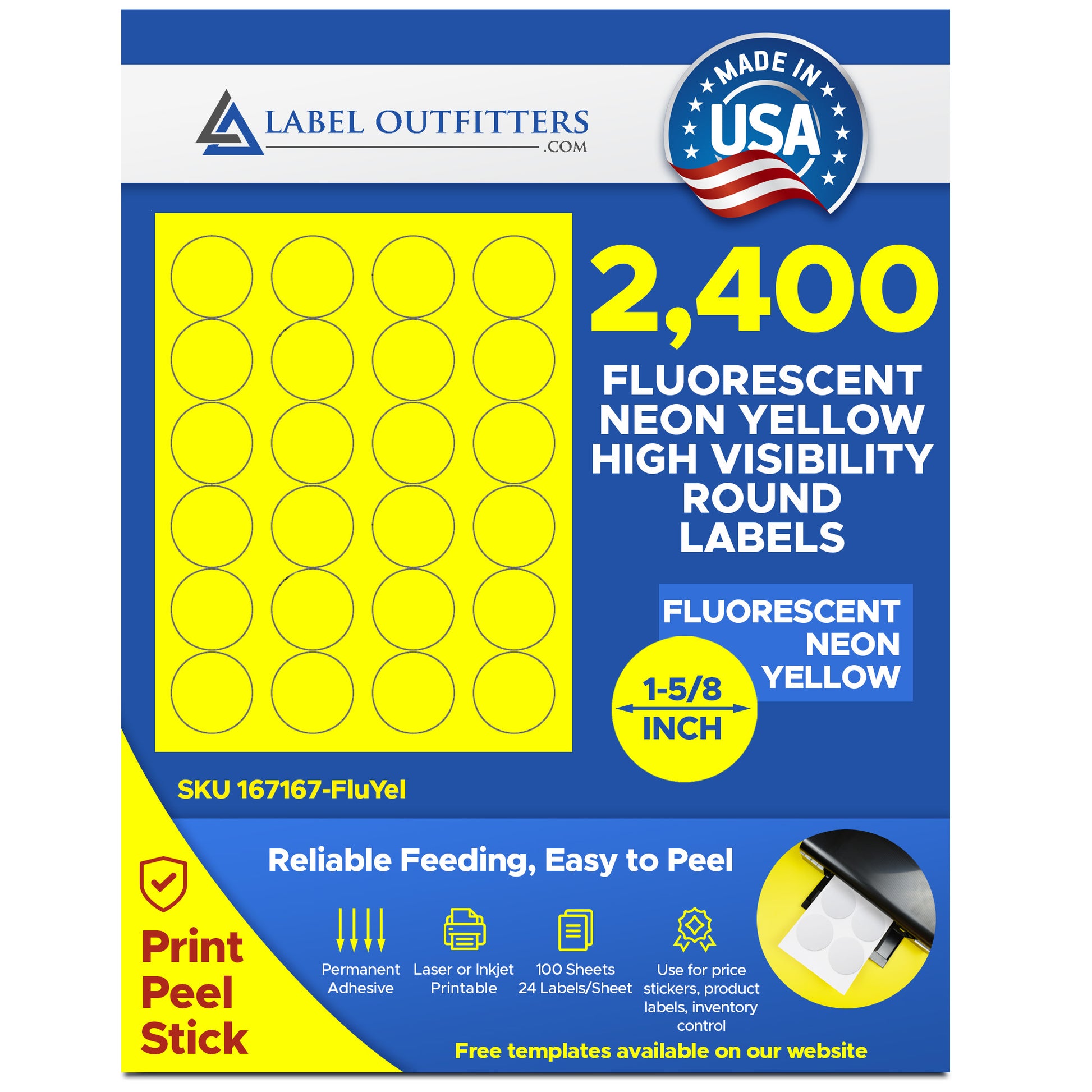2,400 Fluorescent Yellow Labels, 1-5/8 Round, 24 Labels per Sheet,100 Sheets use Avery® 5293 Template