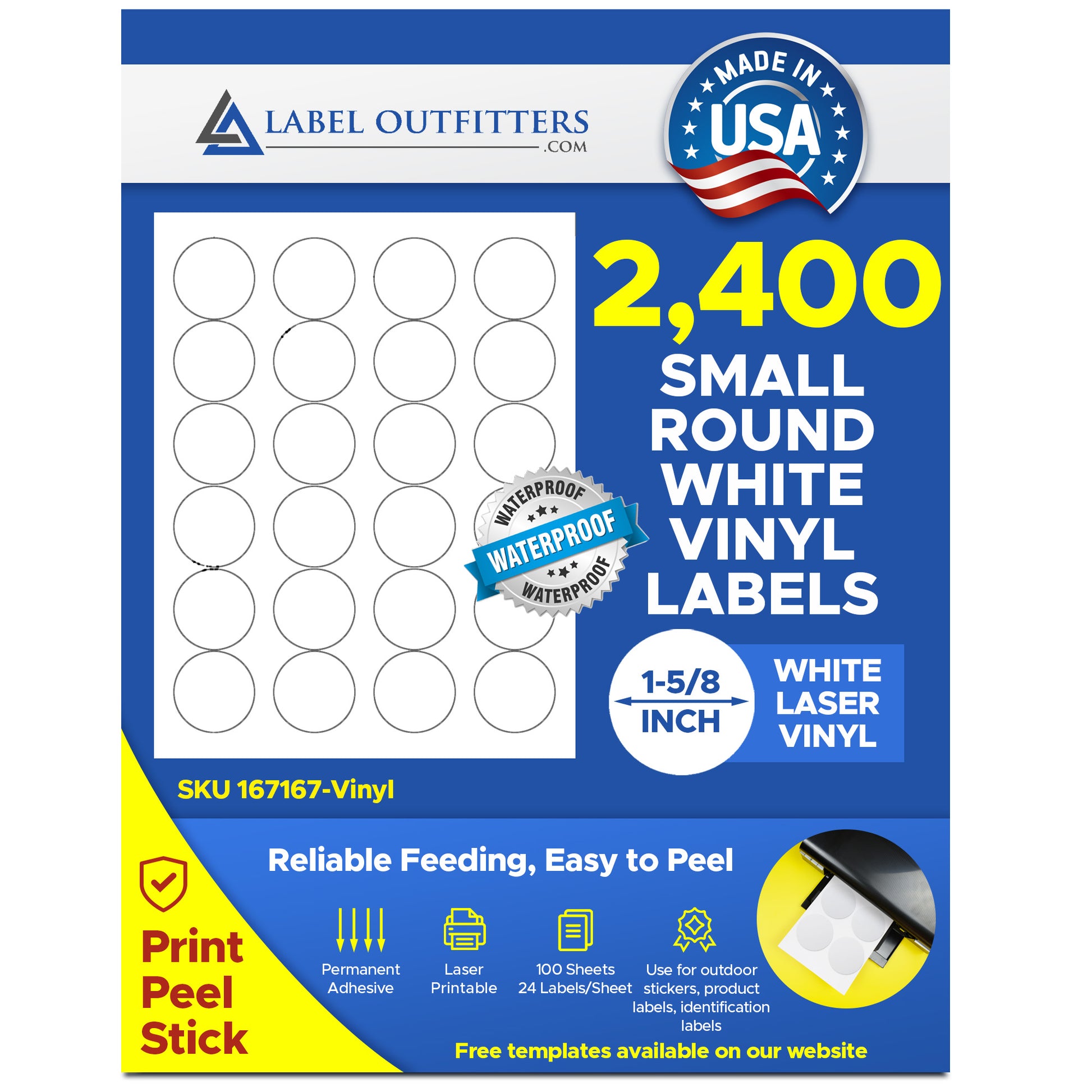 2,400 Vinyl WeatherProof - WaterProof Durable White Laser ONLY Round Labels, 1-5/8 inch Diameter, 24 Labels per Sheet Avery® 5293 Template - 100 Sheets