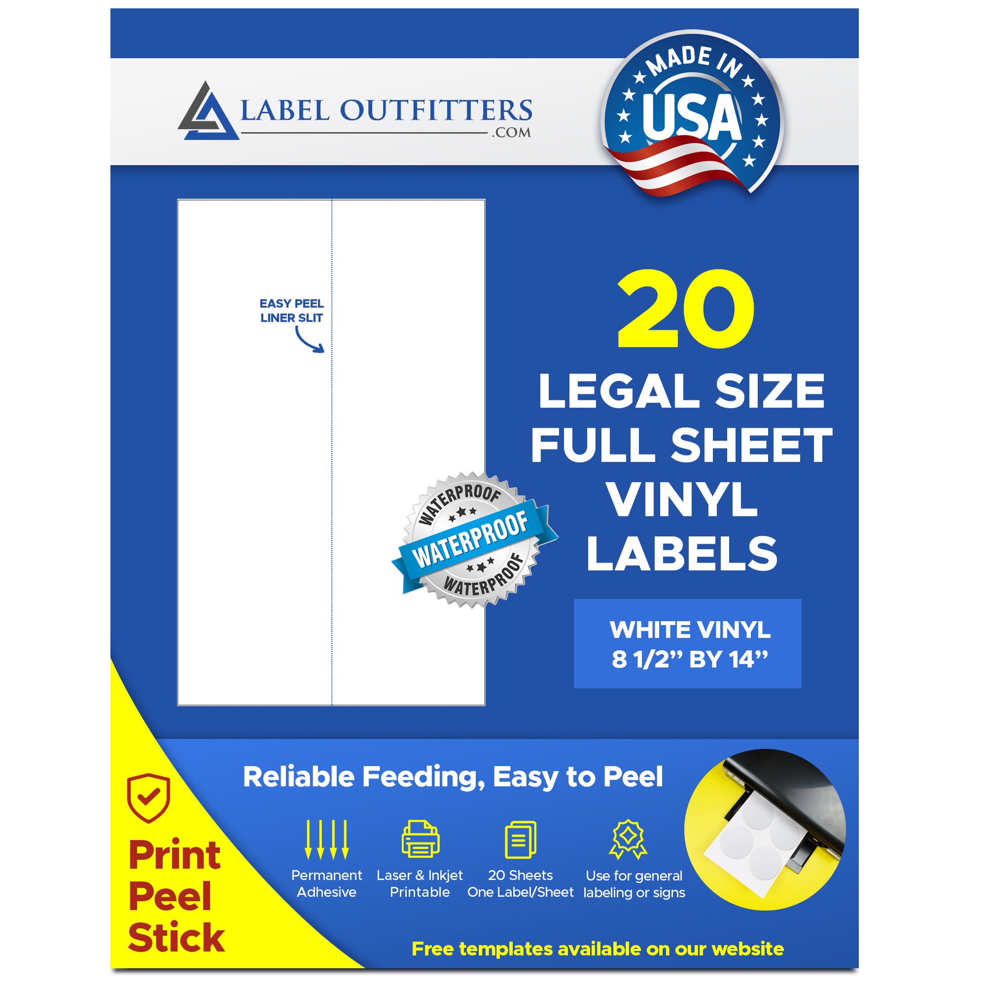 20 Sheets White Very Large Waterproof Vinyl Labels.  Sheet is Legal Size 8-1/2" x 14". This Label has many uses. The number 1 use is Signs!  The large sheet lets you print the largest labels possible on Standard Desktop Printers.
