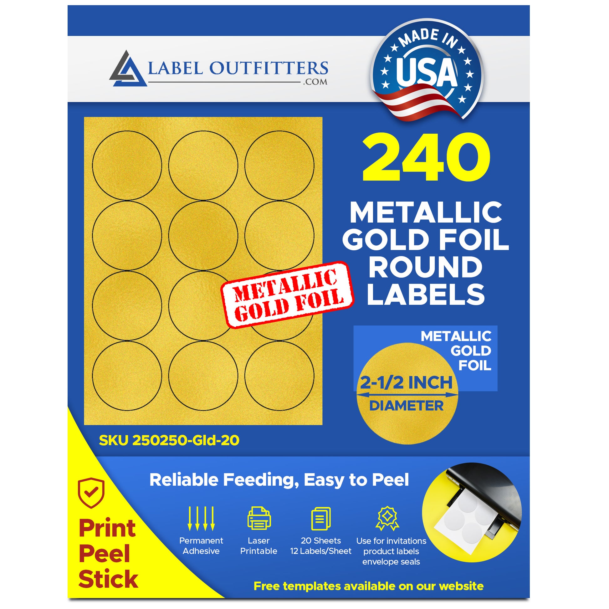 These 240 round gold foil laser labels measure 2.5 inches in diameter and are compatible exclusively with black or color laser printers. Designed to work with the 5294 template, each 8.5" x 11" sheet includes 12 labels made from high-quality gold foil featuring a permanent acrylic adhesive. The package contains 20 sheets, providing a reliable solution for creating professional, eye-catching labels or stickers. Ideal for branding products, organizing albums, or customizing items, these labels combine durability with an elegant finish. Proudly manufactured in the USA.